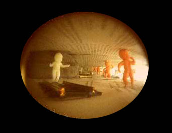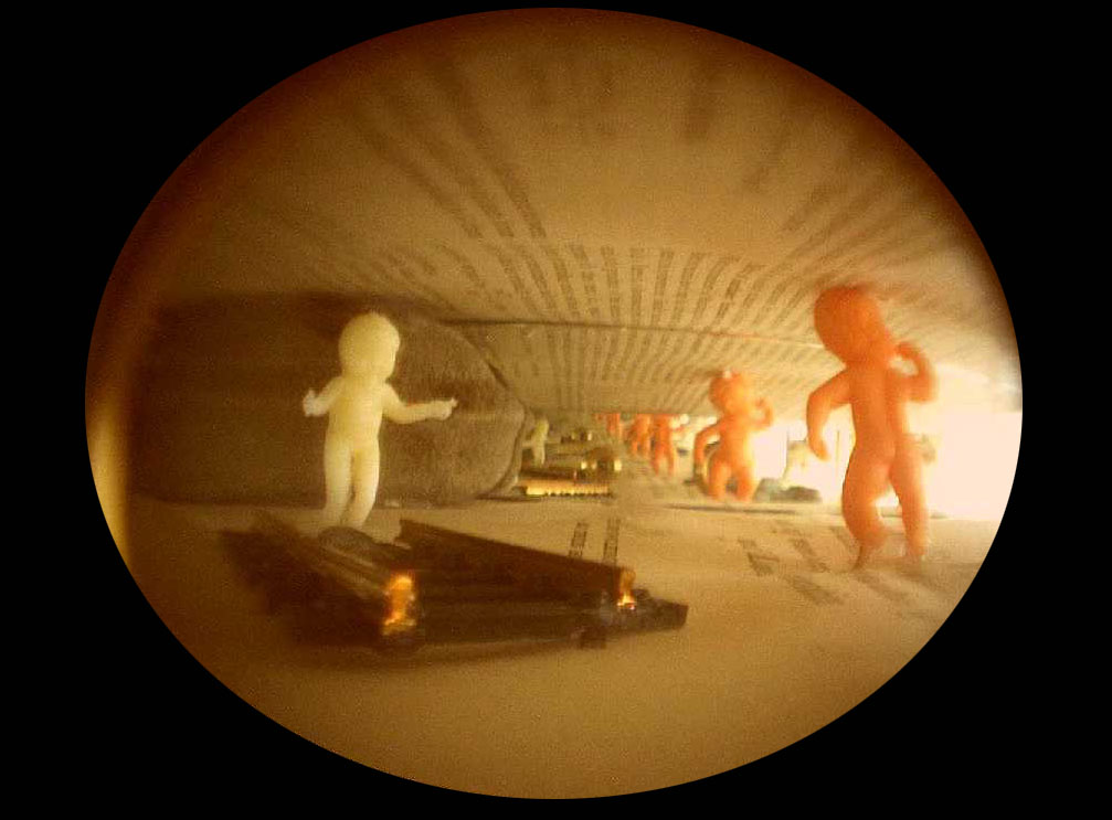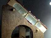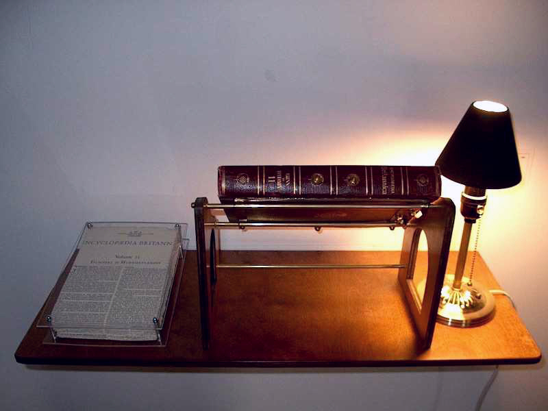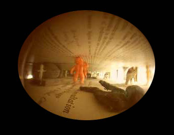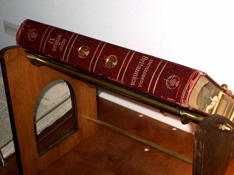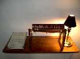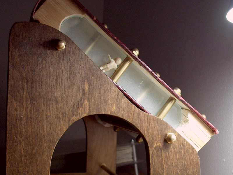 Book, mirrors, frosted glass, judas, found objects, wood, hardware, lamp.